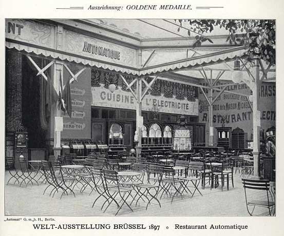 - 1896 - Berliner Gewerbe-Austellung Elektrisch-automatisches Restaurant (Patent Sielaff) auf 900 qm Grundfläche Quelle: Claus Borgelt Montabaur Dieses komplette Automatenrestaurant bot vom frisch gezapften Bier für zehn Pfennig bis zum warmen Essen für eine Mark eine breite Angebotspalette, wie die verbürgte Umsatzstatistik während dieser Messe belegt: 1.724.000 Glas Bier - 182.640 Gläser Wein - 343.900 Gläser Likör - 71.452 Tassen Kaffee - 33.946 Paar Wiener Würstchen - 276.399 belegte Brötchen - 22.075 Portionen kalter Speisen - 332.855 Mal wurde die integrierte automatische Musikkapelle eingeschaltet. Bis zum ersten Weltkrieg gab es im Reichsgebiet über 50 Automatenrestaurants.
